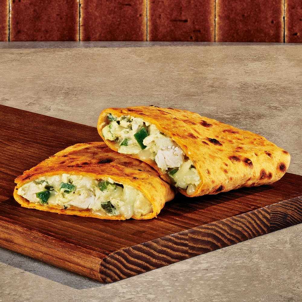 A toasted chile lavash flatbread wrapped and stuffed with diced chicken, charred poblanos, green jalapeños, three-chile-pepper cheese and jalapeño cream cheese.